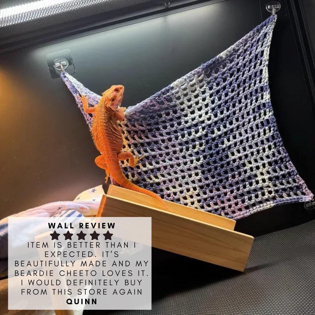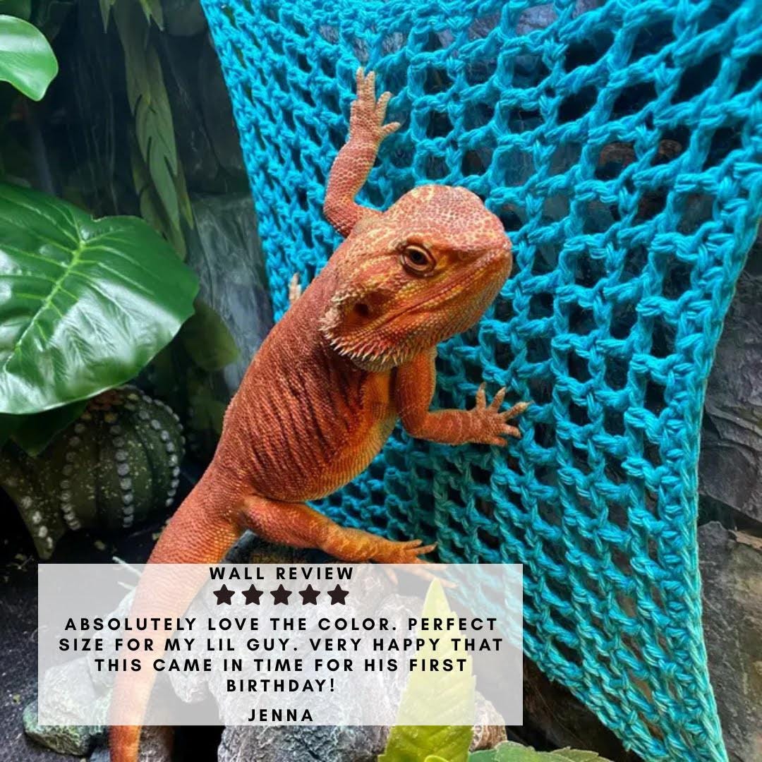 After making a whole lot of reptile bridges, I finally decided to sit down and craft a "climbing wall" solution that's very similar, but sized better! Pleased to bring you another hand crocheted solution to a lizard problem!