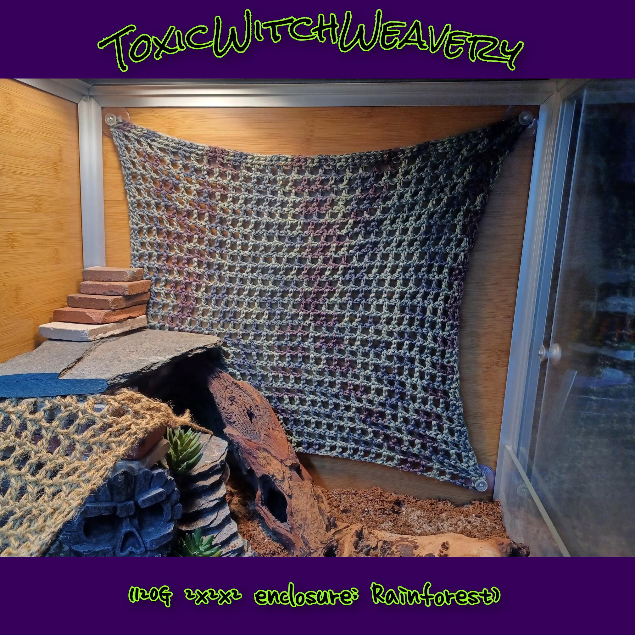 These are crocheted by hand with 100% cotton yarn. I have used different more natural looking materials in the past, but I had too many worries myself of the durability, and mostly the ability to clean and reuse these. Cotton yarn is the same thing your great grandma use to make washcloths and dish towels with, and there's a reason; It's pretty sturdy, comes in any color you can imagine, and best of all, is super easy to wash! Nowadays, just toss it in your washing machine and dryer (after rinsing the majority of the mess off with warm water), and they should come clean! These are made to stretch; Don't be afraid to tug them tight! I make them a little smaller than the side wall of the standard gallon size enclosures, so when weight gets placed on them, they don't sag to the floor.