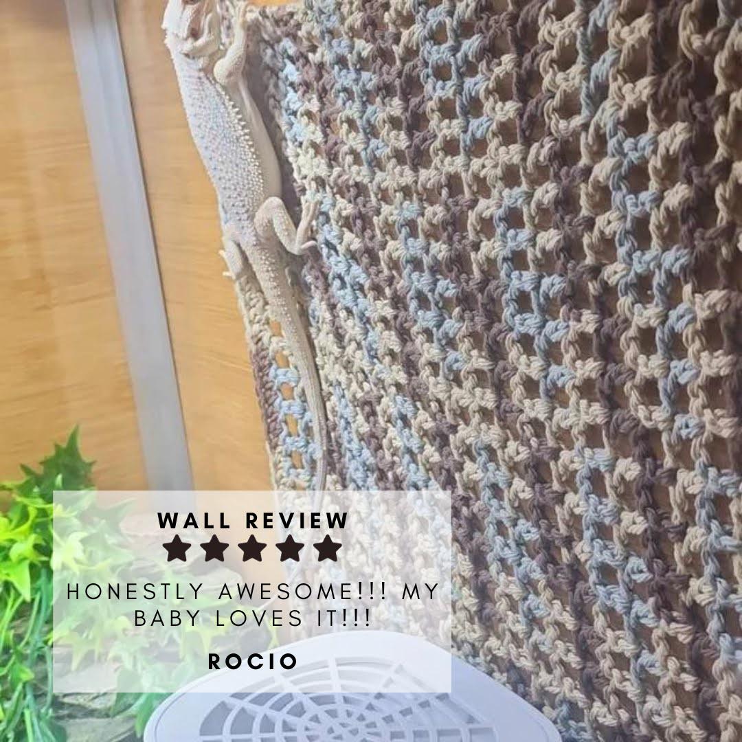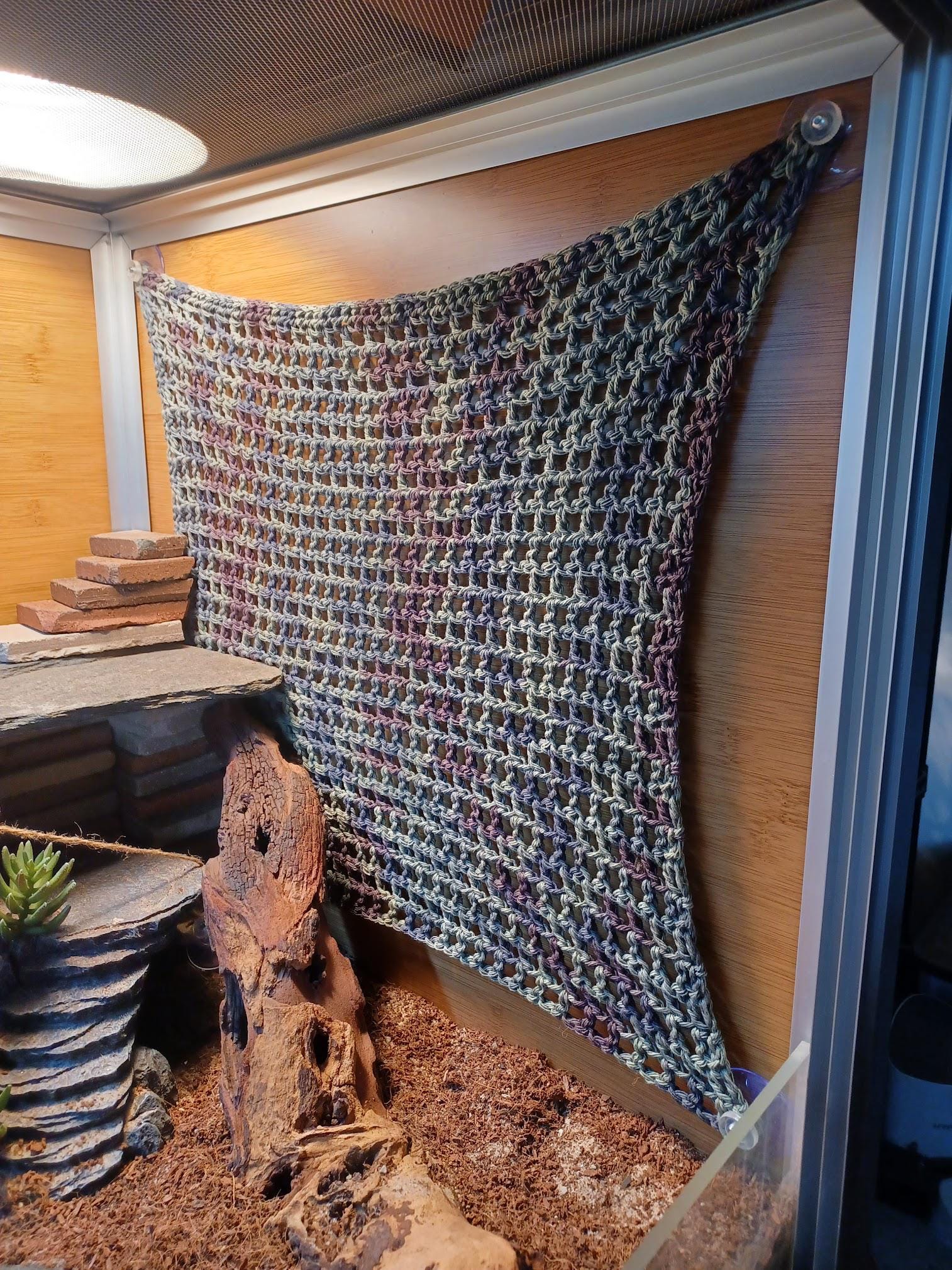 These are crocheted by hand with 100% cotton yarn. I have used different more natural looking materials in the past, but I had too many worries myself of the durability, and mostly the ability to clean and reuse these. Cotton yarn is the same thing your great grandma use to make washcloths and dish towels with, and there's a reason; It's pretty sturdy, comes in any color you can imagine, and best of all, is super easy to wash! Nowadays, just toss it in your washing machine and dryer (after rinsing the majority of the mess off with warm water), and they should come clean! These are made to stretch; Don't be afraid to tug them tight! I make them a little smaller than the side wall of the standard gallon size enclosures, so when weight gets placed on them, they don't sag to the floor.