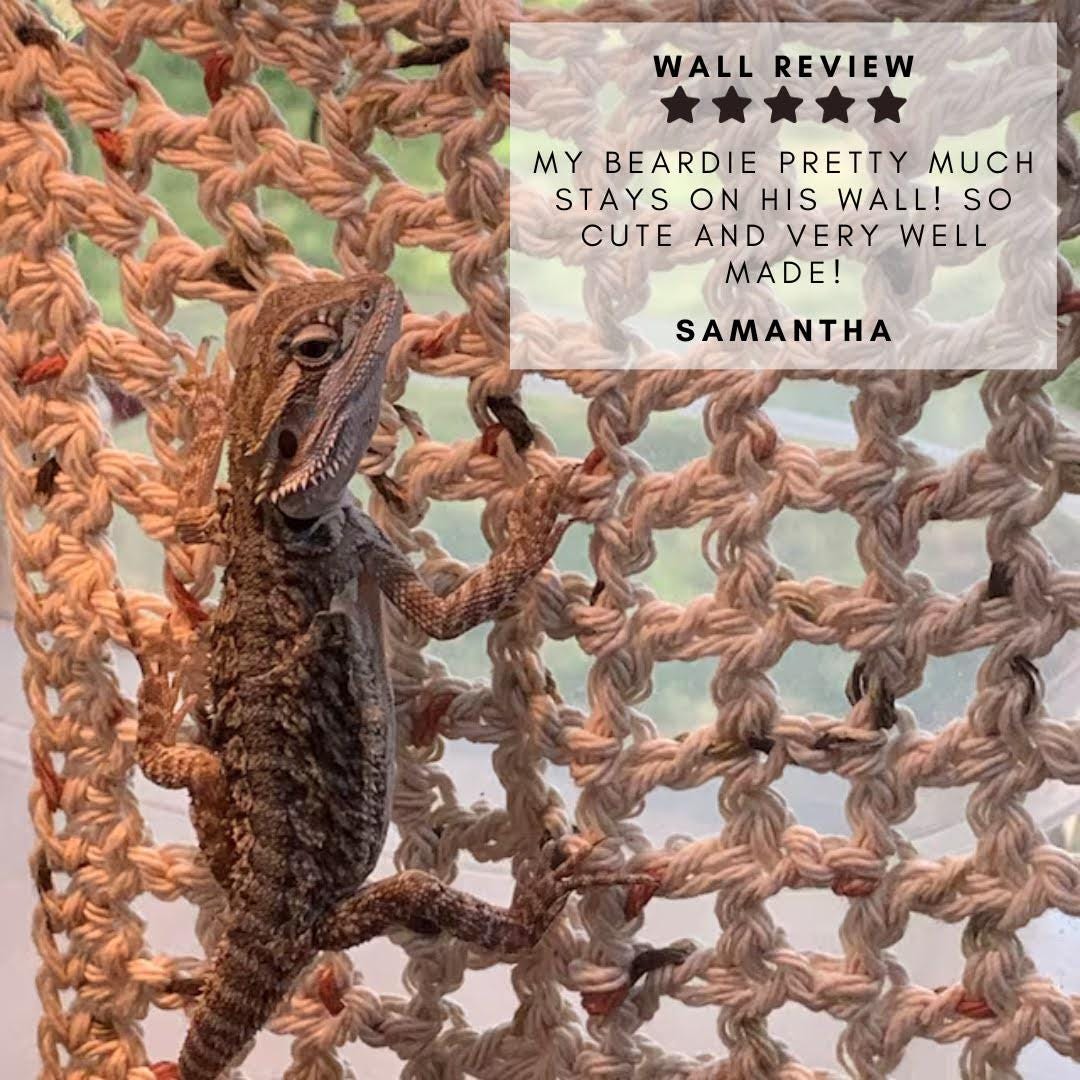 After making a whole lot of reptile bridges, I finally decided to sit down and craft a "climbing wall" solution that's very similar, but sized better! Pleased to bring you another hand crocheted solution to a lizard problem!